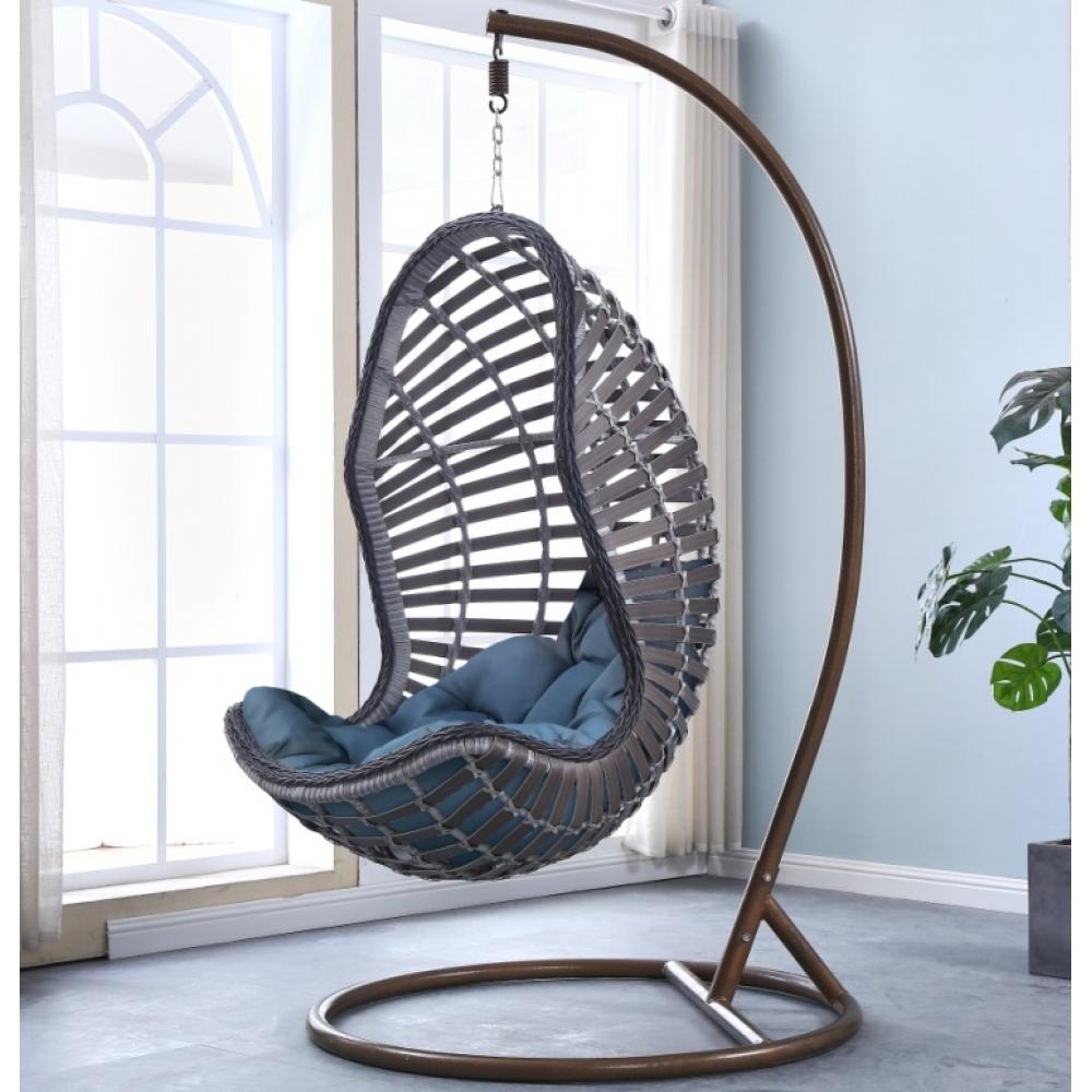 Размер корзины: W82xD75xH127 см Стойка: H2,0xD1,0 м, Каркас сталь. Материал плетения на корзине: широкий искусственный ротанг серого цвета с имитацией под натуральную кожу. Подушка однотонная серая. Ткань с водоотталкивающей пропиткой. Допустимая нагрузка: 120 кг.