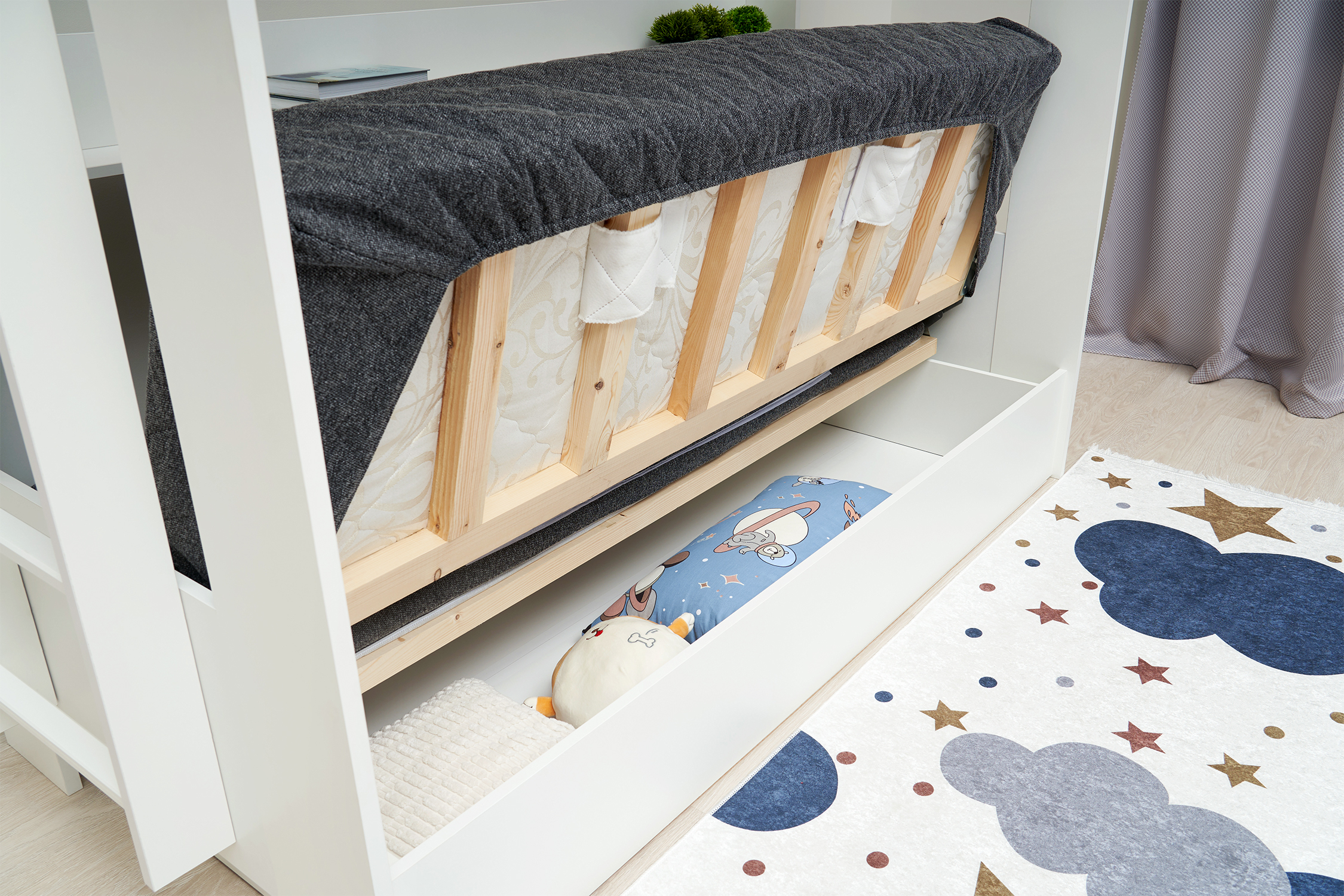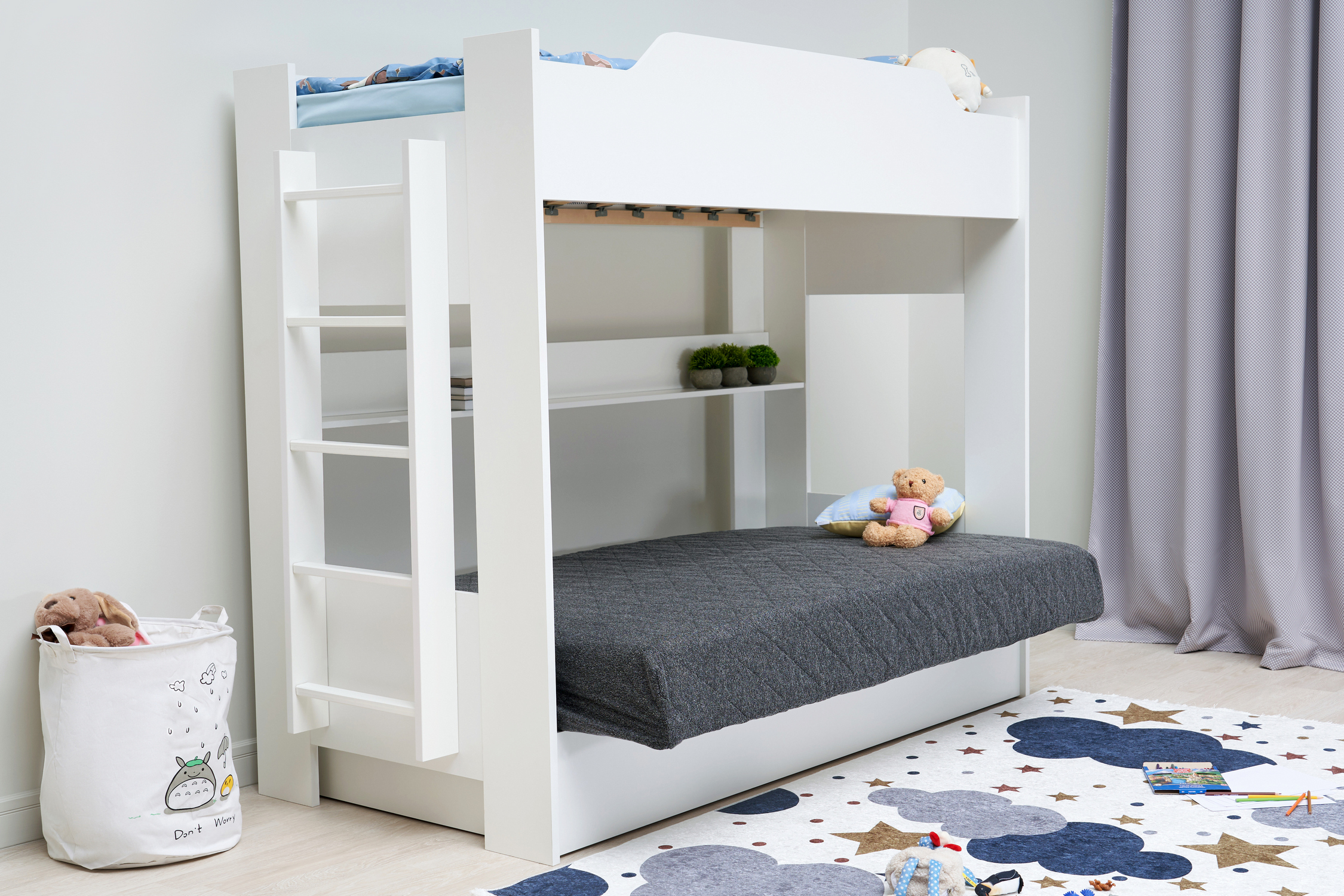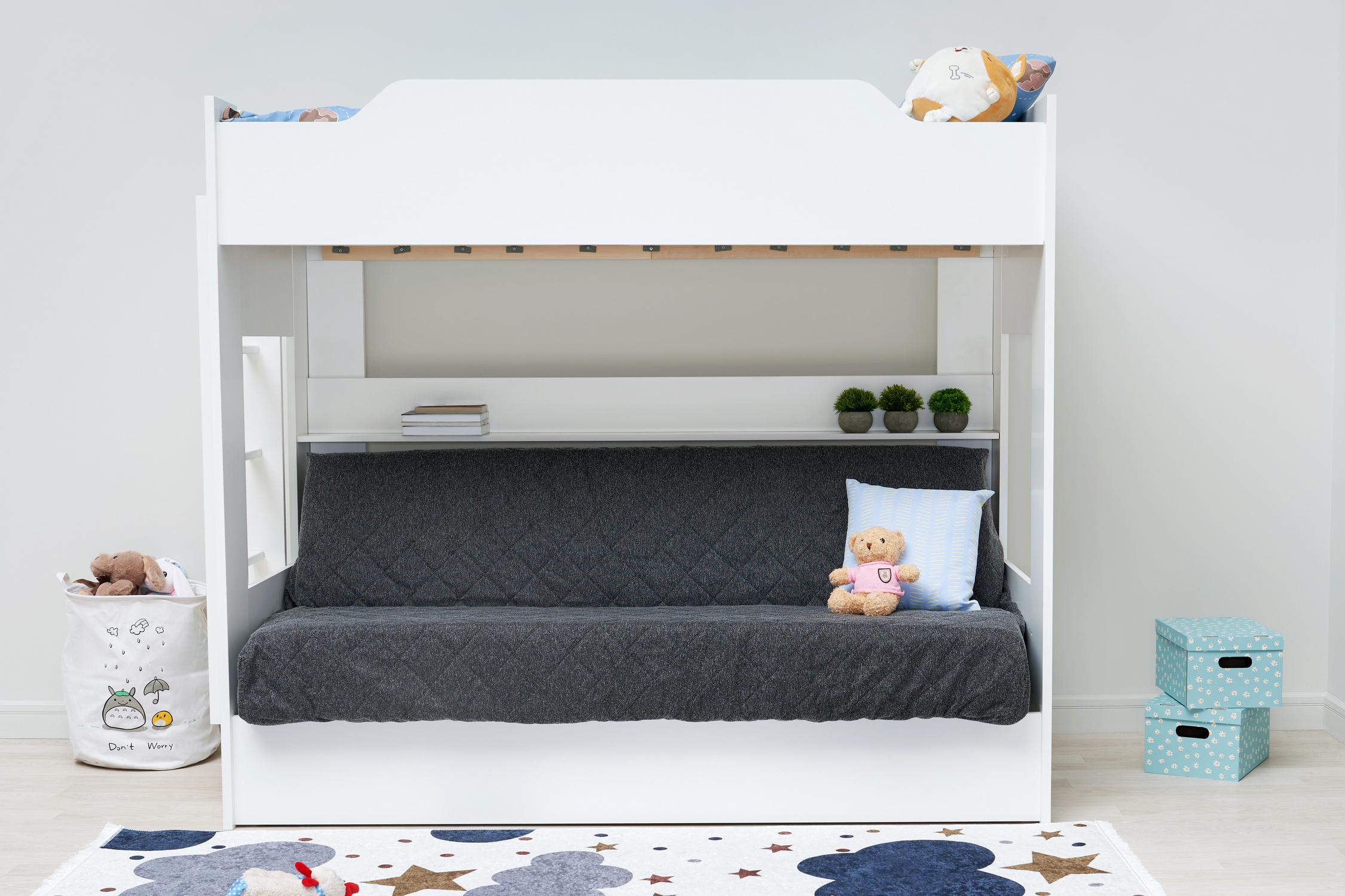 Механизм трансформации дивана: «Книжка». Рекомендуемая высота матраса на верхний ярус 17 см. Максимальная нагрузка на верхний ярус 50 кг. Лестница может быть установлена с обеих сторон кровати. Высота бортика 30 см. Максимальная нагрузка на нижний ярус 90 кг. Чехол съемный. |
