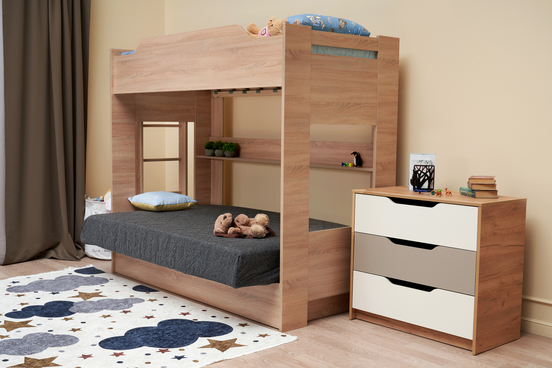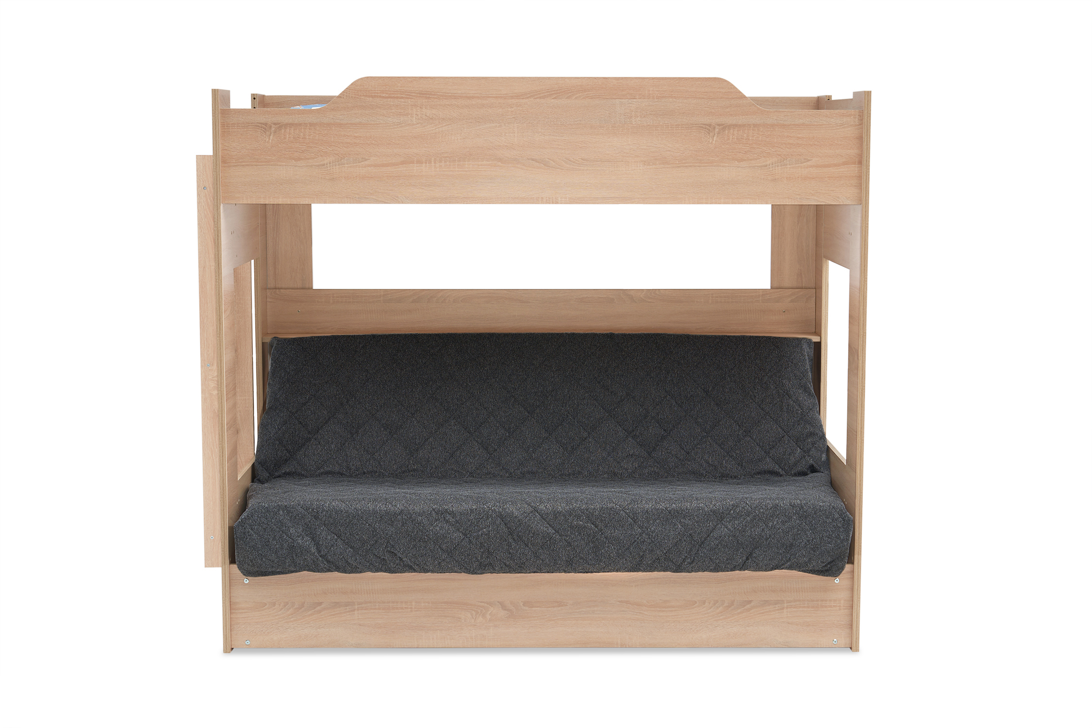Механизм трансформации дивана: «Книжка». Рекомендуемая высота матраса на верхний ярус 17 см. Максимальная нагрузка на верхний ярус 50 кг. Лестница может быть установлена с обеих сторон кровати. Высота бортика 30 см. Максимальная нагрузка на нижний ярус 90 кг. Чехол съемный. |
