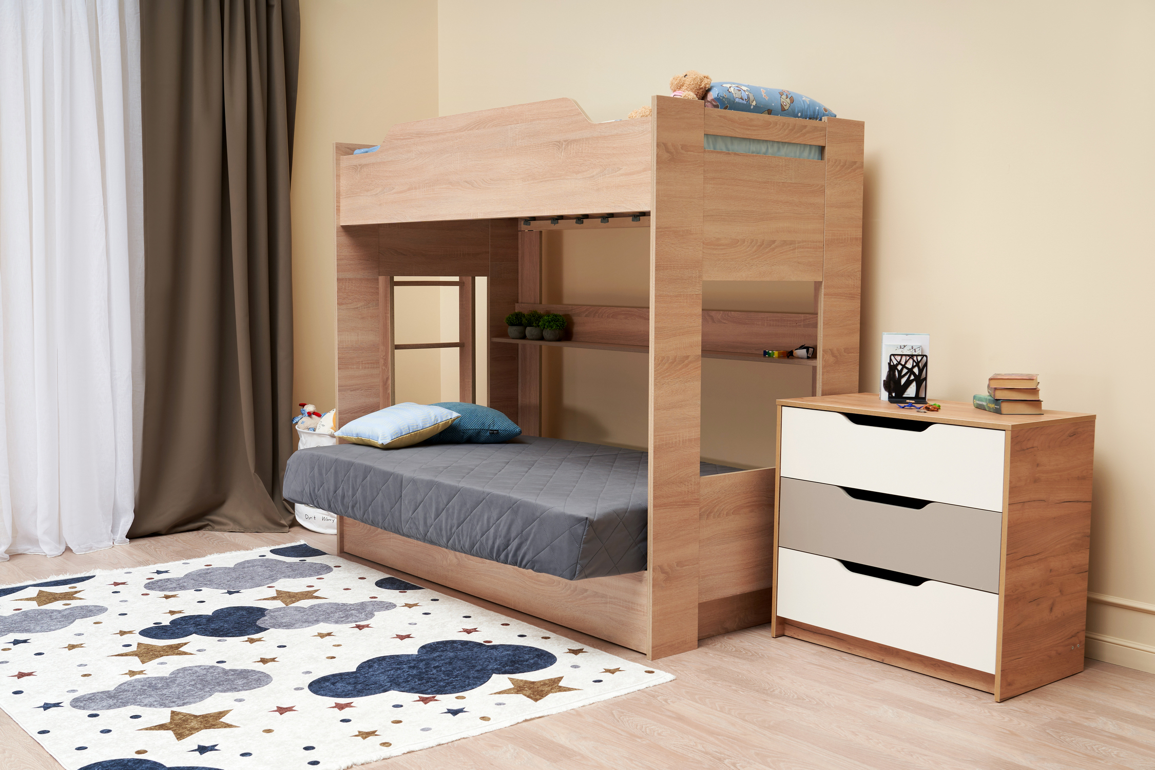 Механизм трансформации дивана: «Книжка». Рекомендуемая высота матраса на верхний ярус 17 см. Максимальная нагрузка на верхний ярус 50 кг. Лестница может быть установлена с обеих сторон кровати. Высота бортика 30 см. Максимальная нагрузка на нижний ярус 90 кг. Чехол съемный. |