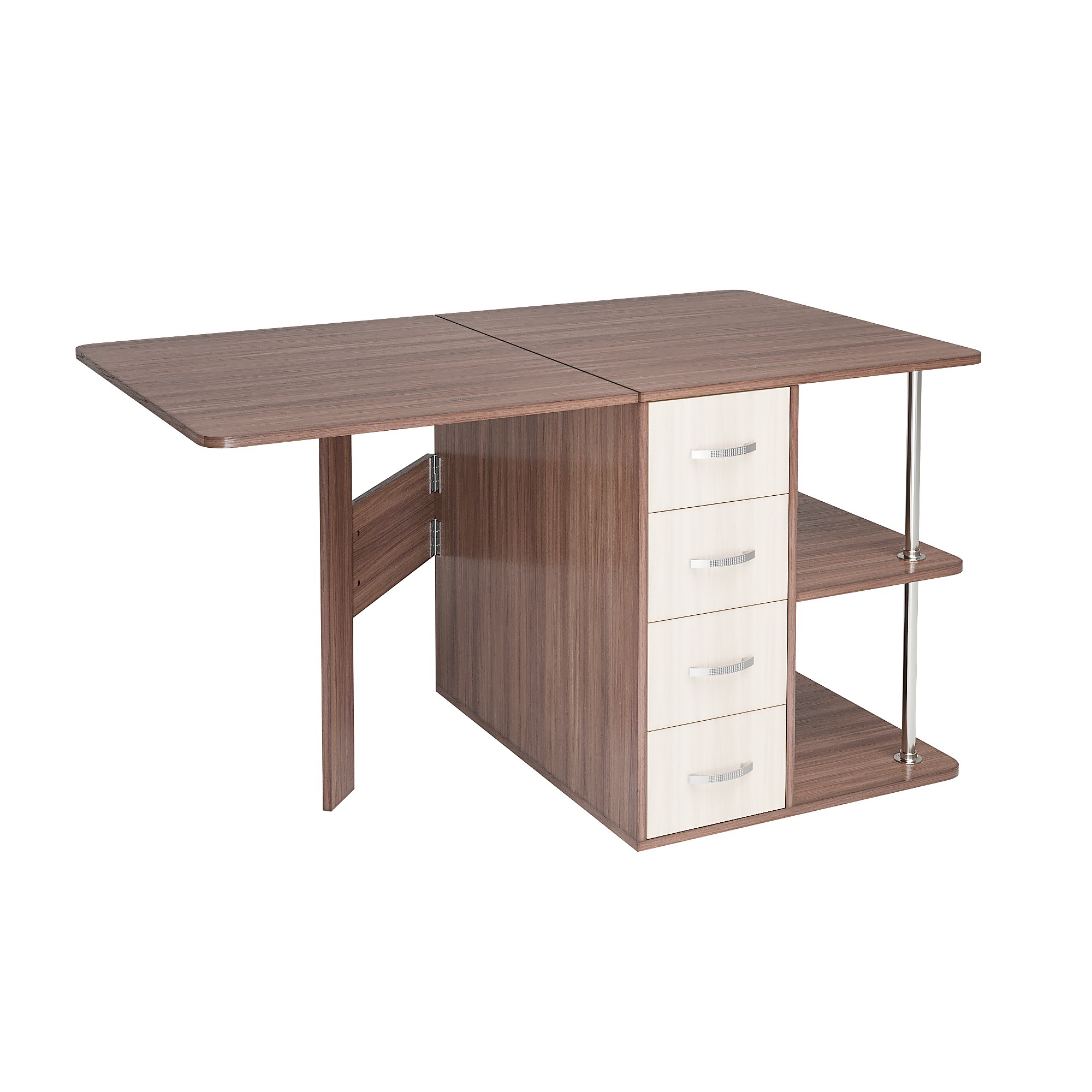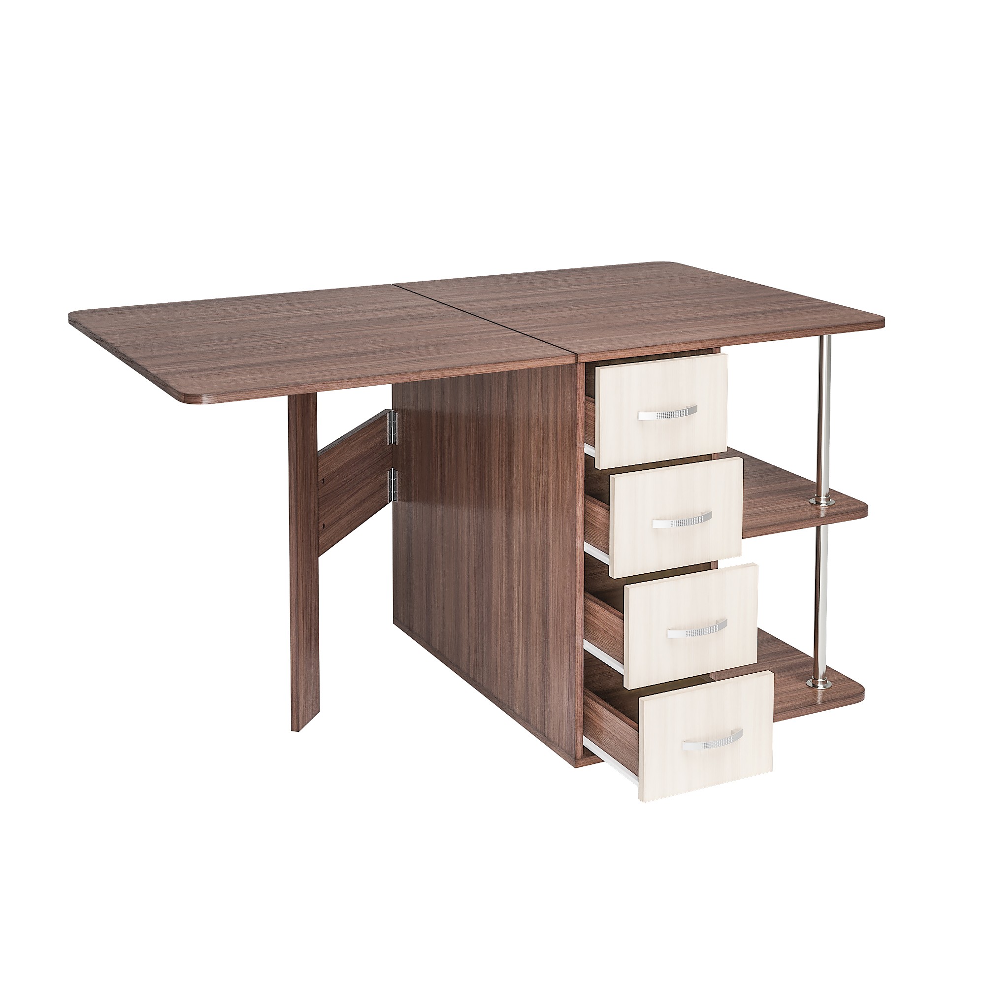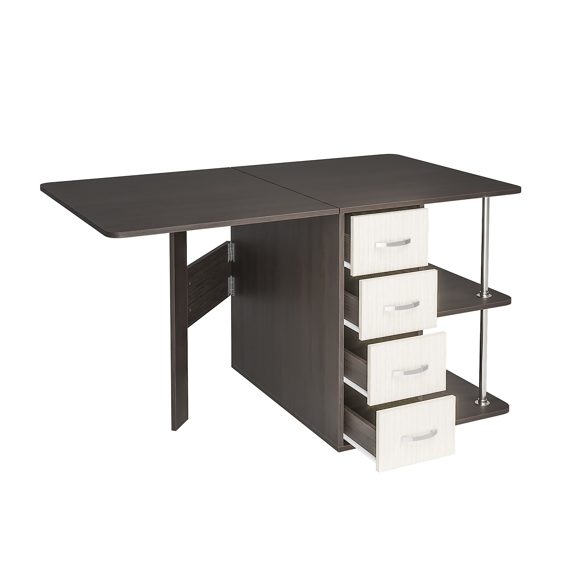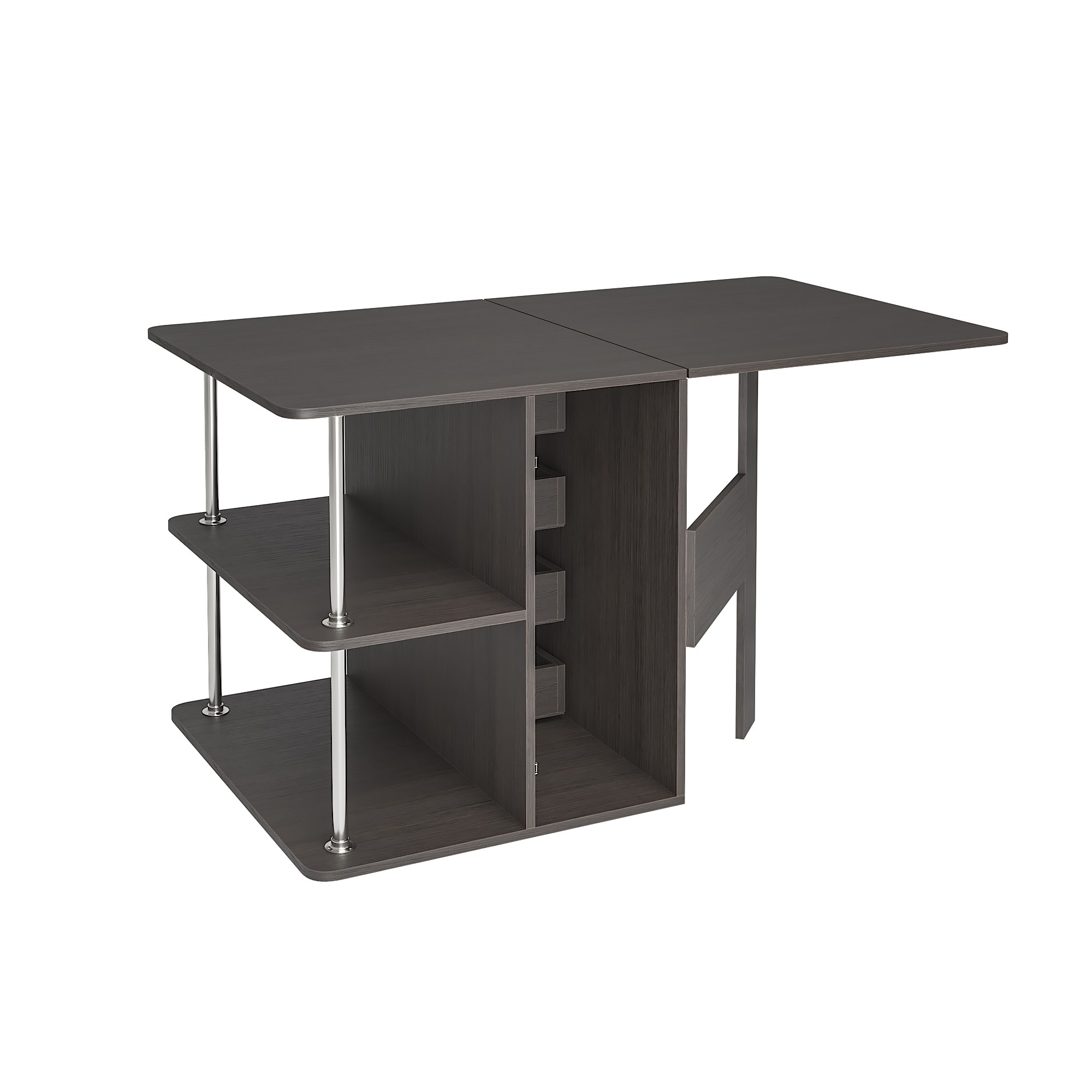 С одной стороны стола находятся ящики для хранения, с другой – распашная створка, которую фиксирует "толкатель" (открывается при нажатии)